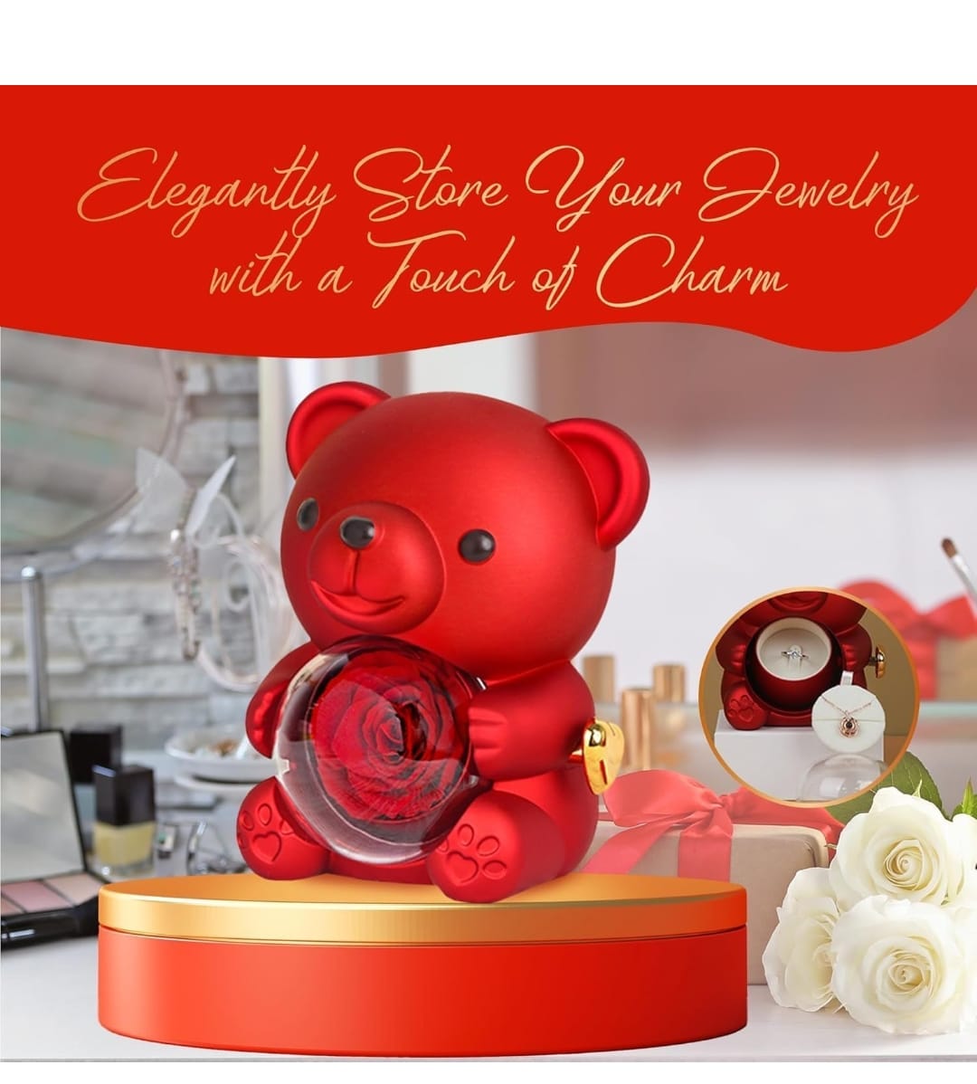 The Forever Rose Teddy Love Box is a premium romantic keepsake designed with a hidden storage compartment — perfect for placing a ring, chain, bracelet, note, or small surprise inside.
